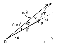 dr represents an infinitesimal displacement, which in turn can be expressed as the sum of two infinitesimal vectors, one of which is radial, that is directed as PO and with magnitude dr, and the other one is tangential, that is perpendicular to OP, with magnitude r dθ.