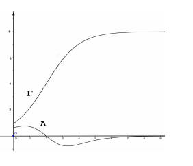 Una funzione f(x) è definita e derivabile, insieme alle sue derivate prima e seconda, in [0,+∞[ e nella figura sono disegnati i grafici Γ e Λ di f(x) e della sua derivata seconda f''(x). La tangente a Γ nel suo punto di flesso, di coordinate (2;4), passa per (0;0), mentre le rette y=8 e y=0 sono asintoti orizzontali per Γ e Λ, rispettivamente.