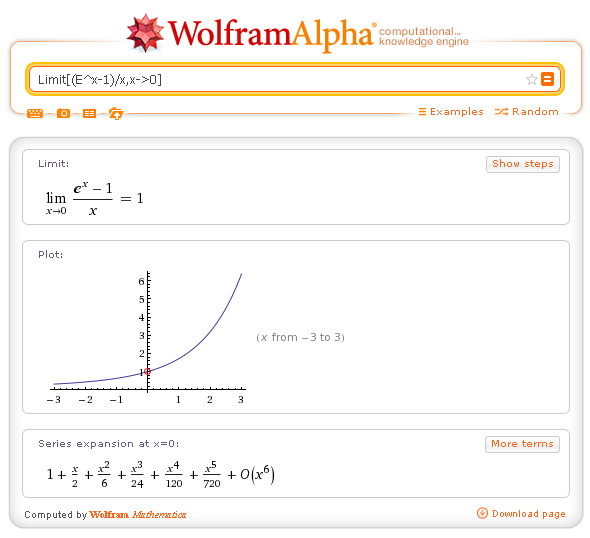 | Limit[f[x],x->x0] | calculate the limit as x→x0 | Limit[(E^x-1)/x,x->0] |