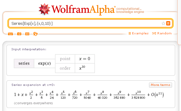 | Series[f[x],{x,0,n}] | generates n+1 terms of the expansion in MacLaurin power series for f(x) | Series[Exp[x],{x,0,10}] |