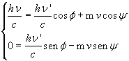 Esprimendo con m0 la massa dell'elettrone a riposo, con m la massa dell'elettrone dopo l'urto, con φ e ψ le direzioni delle particelle dopo l'urto rispetto alla direzione del fotone incidente e con ν' la frequenza del fotone dopo l'urto, per la conservazione della quantità di moto si ha