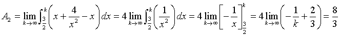 L'area A della regione evidenziata in figura è data dalla somma dell'area A1 della regione comprese tra γ e t per 1<k≤3/2 e l'area A2 della regione compresa tra γ e l'asintoto obliquo per k>3/2.
