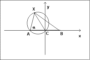 c) posto X, appartenente a γ, in uno dei due semipiani di origine la retta per A e per B e indicato con α l'angolo XAC si illustri l'andamento della funzione y = f(x) con f(x) = (XB / XA)2 e x = tg α.