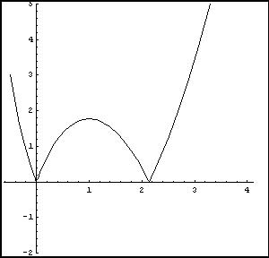 Il modulo ha un massimo relativo per x=1, due punti angolosi nell'origine e in A.
